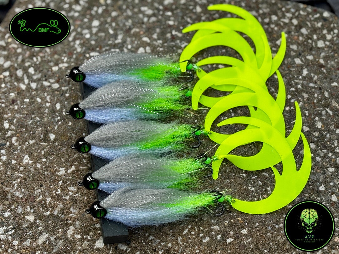 Built on a 4/0 Aberdeen hook with a size 2 treble tail hook for increased hook ups. We have used an articulated stainless steel spine to increase the overall durability and as with all our jig flies they include a large dragon curl tail and rattle.